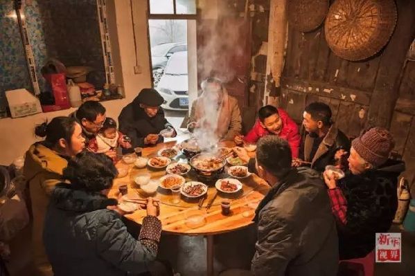 湖北省建始縣花坪鄉(xiāng)張家槽村的一戶家庭圍坐一起吃團圓飯。新華社發(fā)(周阿寒 攝)