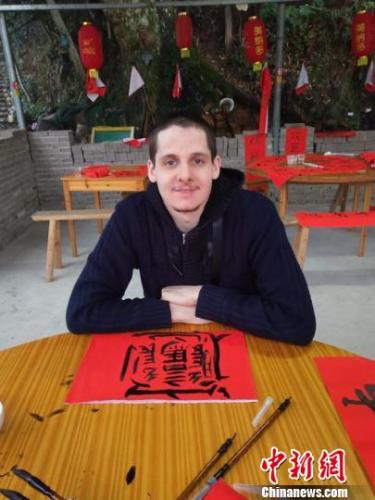 外國(guó)游客學(xué)寫(xiě)春聯(lián) 武義提供