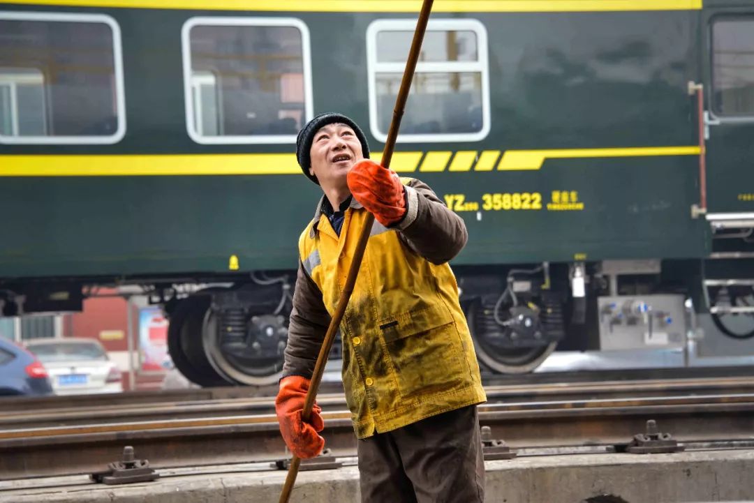 2019-02-01,河南鄭州火車站。“錘叔”鄭獻(xiàn)敏是鄭州車輛段的職工,38年來(lái),他忙碌于站臺(tái)上,穿梭于股道間,用一把小小的檢車錘確保著南來(lái)北往的旅客的乘車安全。作者:趙慶