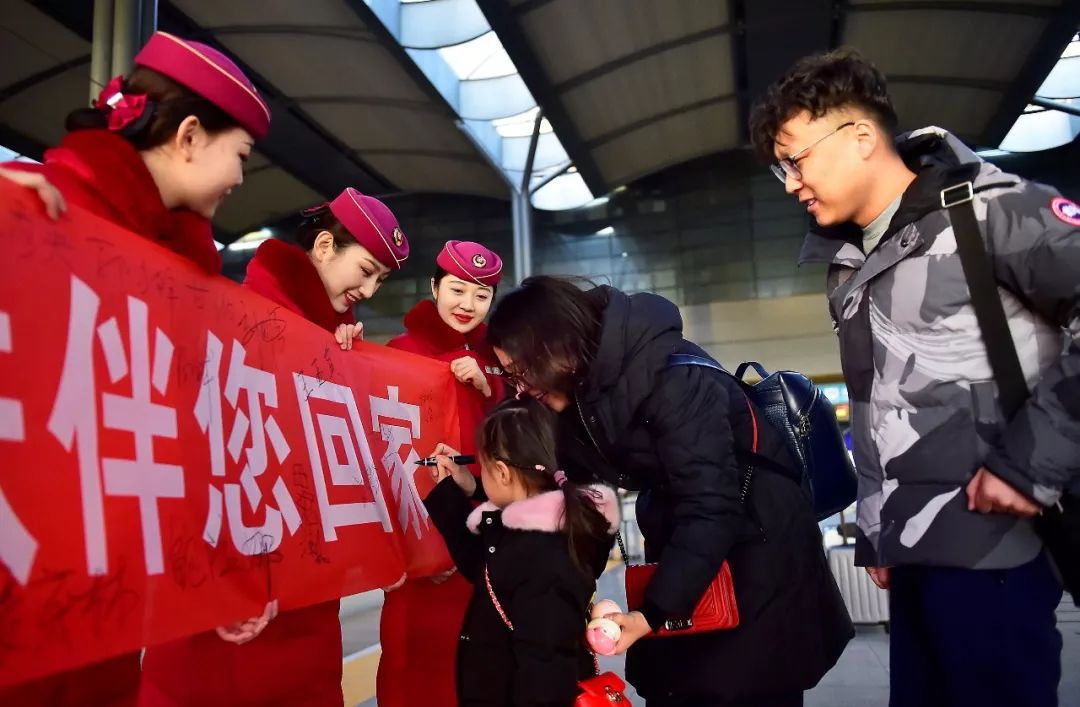 2019-02-03,天津西站。開(kāi)車前,旅客與列車乘務(wù)人員在天津西站站臺(tái)上共同寫下新年祝福。作者:三木