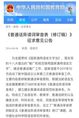 1985年,國(guó)家發(fā)布《普通話異讀詞審音表》,對(duì)一些異讀詞進(jìn)行了修訂。2016發(fā)布的《<普通話異讀詞審音表(修訂稿)>征求意見稿》又對(duì)一些讀音進(jìn)行了新的修訂,并發(fā)布在教育部網(wǎng)站上征求意見。