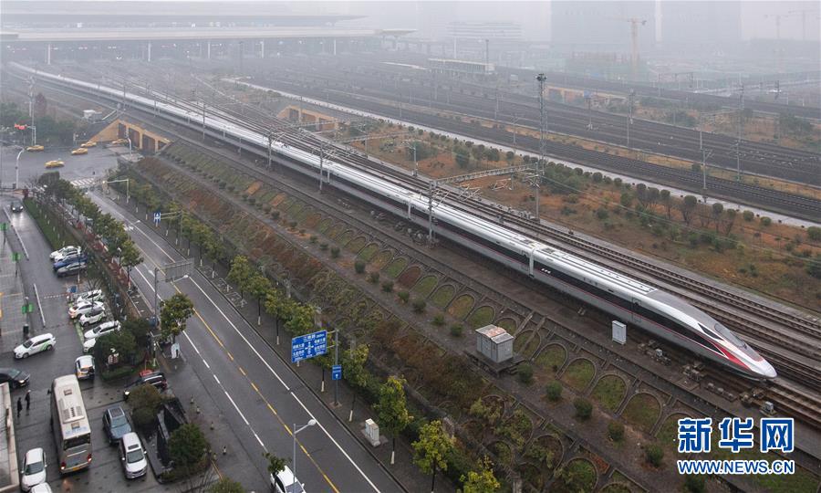 1月5日,G9次超長版“復(fù)興號”動車組列車駛?cè)肽暇┠险尽P氯A社發(fā)(蘇陽 攝)