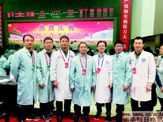 ▲1月11日,北京航天飛行控制中心,科普載荷總設(shè)計(jì)師謝更新(右四)、副總指揮楊小俊(右五)、主任設(shè)計(jì)師張?jiān)獎?右二)以及航天五院、中科院光電所等單位參研人員合影慶祝嫦娥四號任務(wù)圓滿成功。 受訪者供圖