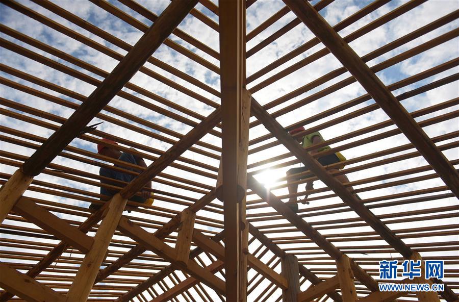 在湖北省宣恩縣曉關(guān)侗族鄉(xiāng),工人在建設吊腳樓(2018年7月26日攝)。2018年,當?shù)卣_始修建6座新的侗寨吊腳樓,為符合易地搬遷政策的貧困戶實施搬遷。新華社發(fā)(王俊 攝)