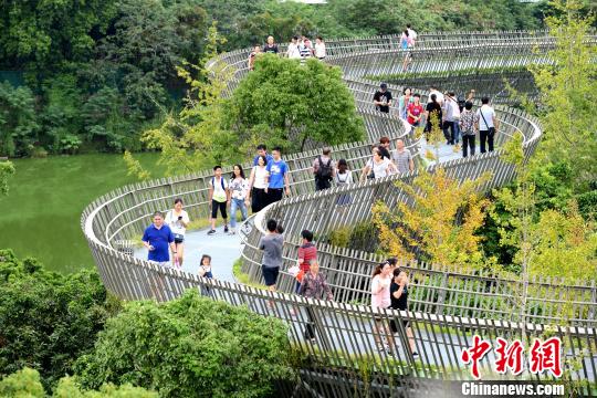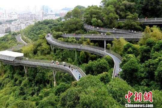 只要一有空,賴慶龍都要來逛“福道”,游山玩水、休閑健身兩不誤。“走‘福道’像是穿梭在山中,又沒有登山那么累。”賴慶龍說,“福道”的設計很新穎,鏤空的棧道可以看到山的原貌,登到高處遠眺時還能看到自己的家。