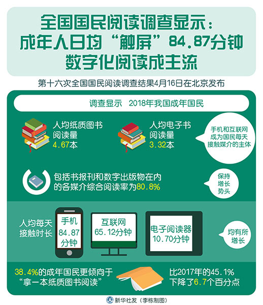 新華社北京4月16日電(記者 史競男)第十六次全國國民閱讀調(diào)查結(jié)果16日在京發(fā)布。調(diào)查顯示,2018年我國成年國民人均紙質(zhì)圖書閱讀量為4.67本、電子書閱讀量為3.32本,手機(jī)和互聯(lián)網(wǎng)成為國民每天接觸媒介的主體,紙質(zhì)書報刊的閱讀時長均有所減少。