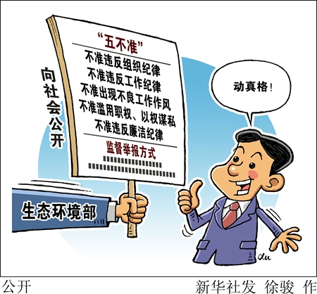 新華社北京5月16日電(記者高敬)記者從生態環境部獲悉,此前曾有環境執法人員在專項督查或檢查期間,發生違反廉潔紀律的問題。為嚴明紀律,中央紀委國家監委駐生態環境部紀檢監察組5月16日發布公告,向社會公開了生態環境部污染防治攻堅戰強化監督工作“五不準”,并公布紀律作風監督舉報方式。