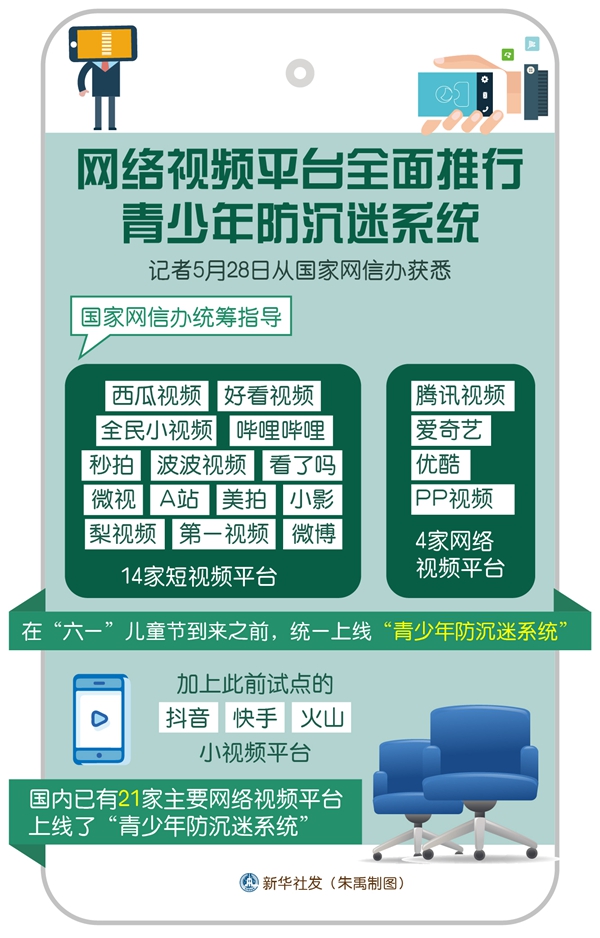 新華社北京5月28日電(記者余俊杰)記者28日從國家網信辦獲悉,國家網信辦統籌指導西瓜視頻、好看視頻、全民小視頻、嗶哩嗶哩、秒拍、波波視頻、看了嗎、微視、A站、美拍、小影、梨視頻、第一視頻、微博等14家短視頻平臺,以及騰訊視頻、愛奇藝、優酷、PP視頻等4家網絡視頻平臺,在“六一”兒童節到來之前,統一上線“青少年防沉迷系統”。