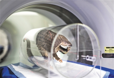 3月底,廣東野生動(dòng)物救護(hù)中心接收了一批由海關(guān)查沒的走私穿山甲。圖為一只被救護(hù)的穿山甲在動(dòng)物醫(yī)院做CT檢查。受訪者供圖