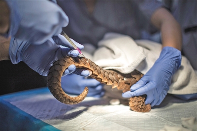 一只被救護(hù)的穿山甲尾巴出現(xiàn)化膿,救護(hù)人員在對(duì)其進(jìn)行檢查和治療。受訪者供圖