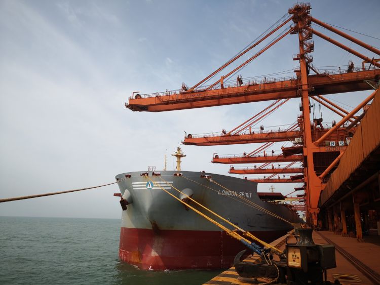 數十公里外,渤海海岸,曹妃甸港,繁忙碼頭。40萬噸鋼鐵巨獸穿行波瀾壯闊的太平洋奔達這里,卸下如山的礦石。