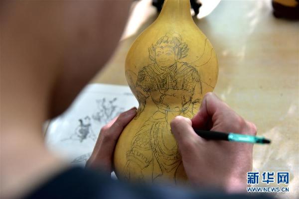 午后陽光和煦,聽障生創新創業工作室里,來自貴州的徐崇瑞手持鉛筆,在一個嶄新的葫蘆上勾勒年畫,筆法細膩,有條不紊。身后的書架上整齊擺放著他們制作的葫蘆烙畫、手工皮包、糧食鑲嵌畫等作品。