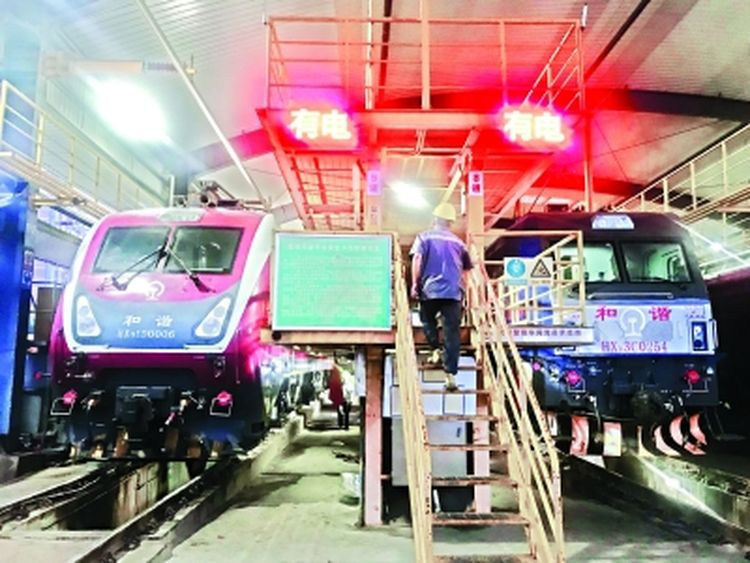 車頭每來回牽引完一趟列車,需回到檢修庫進行全身“體檢”。檢修團隊隨之登場,每臺車頭的檢修時間不能超過70分鐘,檢修完后,車頭就進入待命狀態(tài),按照計劃執(zhí)行新的牽引任務。