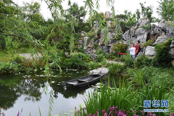 7月7日,游客在湖南園中參觀。當日,2019年中國北京世界園藝博覽會“湖南日”活動在北京世園會園區舉行。新華社發(任超 攝)
