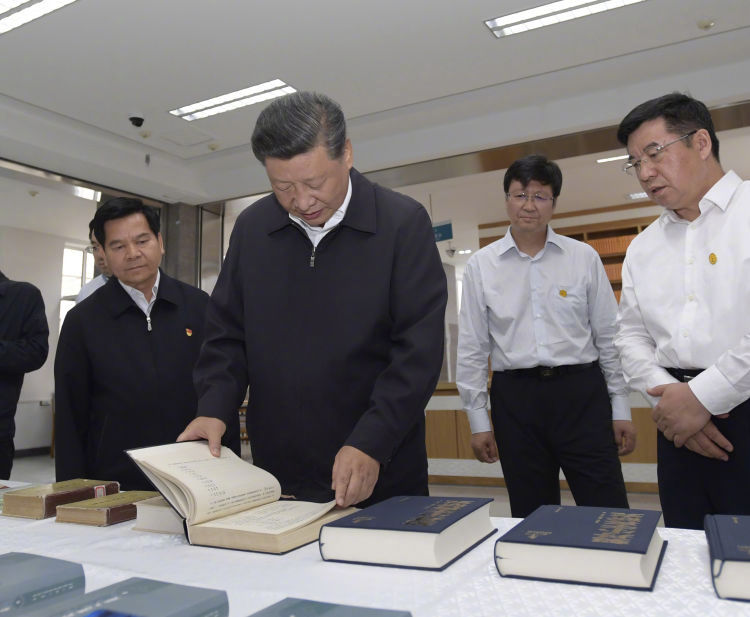 蒙古文古籍展閱室收藏了眾多歷史文化典籍,記載了蒙古族文化與其他民族文化融合發(fā)展的歷史。習(xí)近平總書記認(rèn)真聽講解,不時(shí)駐足端詳。