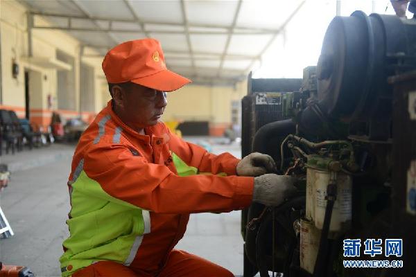 青海省湟源公路段湟源工區(qū)職工方萬品在車間內檢修發(fā)電機(7月29日攝)。新華社發(fā)(王浡 攝)