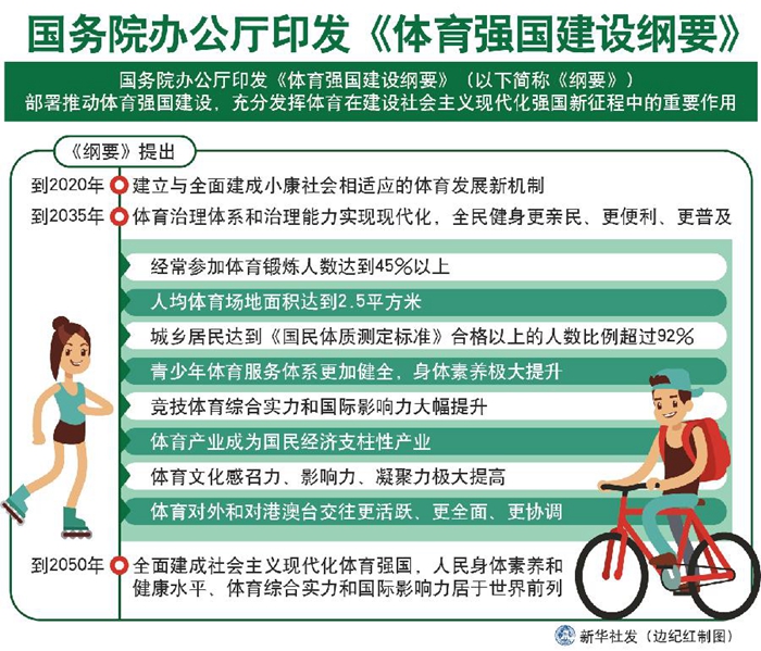 《綱要》提出,到2020年,建立與全面建成小康社會相適應的體育發展新機制。到2035年,體育治理體系和治理能力實現現代化,全民健身更親民、更便利、更普及,經常參加體育鍛煉人數達到45%以上,人均體育場地面積達到2.5平方米,城鄉居民達到《國民體質測定標準》合格以上的人數比例超過92%;青少年體育服務體系更加健全,身體素養極大提升;競技體育綜合實力和國際影響力大幅提升,體育產業成為國民經濟支柱性產業,體育文化感召力、影響力、凝聚力極大提高,體育對外和對港澳臺交往更活躍、更全面、更協調。到2050年,全面建成社會主義現代化體育強國,人民身體素養和健康水平、體育綜合實力和國際影響力居于世界前列。
