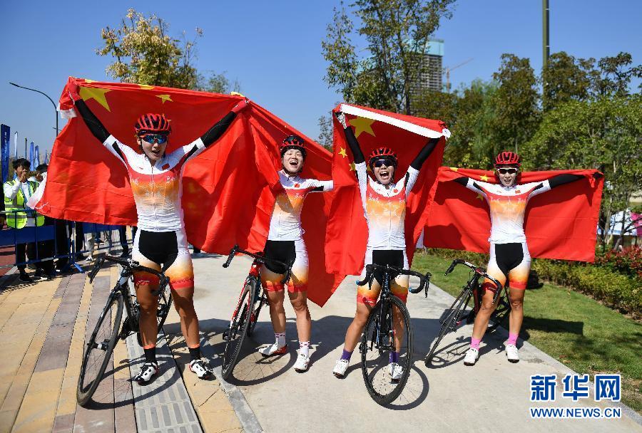 ??? 10月20日,中國(guó)隊(duì)選手趙茜沙、普譯嫻、梁洪玉和孫佳君(從右至左)慶祝奪冠。 當(dāng)日,在武漢舉行的第七屆世界軍人運(yùn)動(dòng)會(huì)公路自行車(chē)女子公路團(tuán)體決賽中,中國(guó)隊(duì)以4小時(shí)05分46秒的成績(jī)獲得金牌。 新華社記者李尕?cái)z