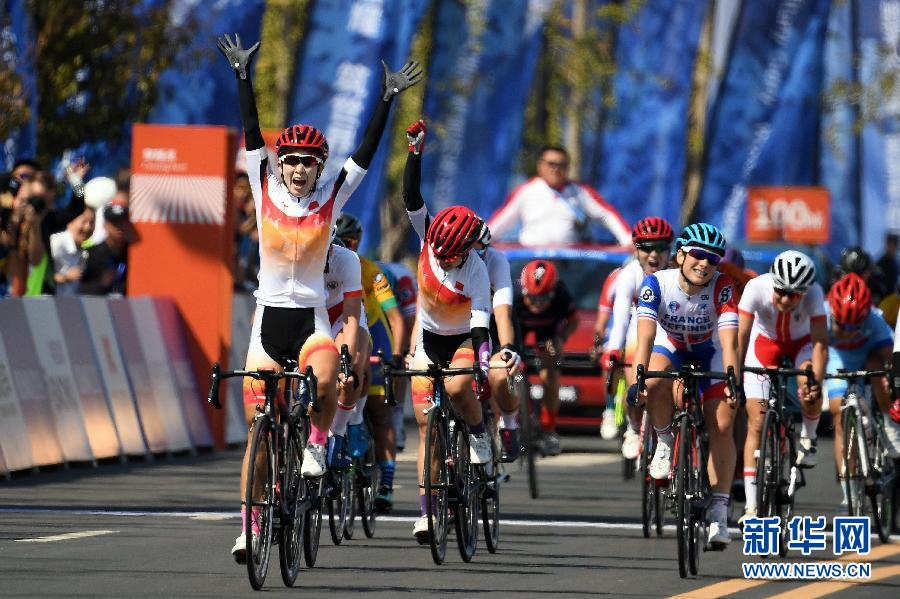 10月20日,中國(guó)隊(duì)選手趙茜沙(左)沖過(guò)終點(diǎn)后慶祝。 當(dāng)日,在武漢舉行的第七屆世界軍人運(yùn)動(dòng)會(huì)公路自行車(chē)女子公路個(gè)人決賽中,中國(guó)隊(duì)選手趙茜沙以2小時(shí)02分53秒的成績(jī)獲得冠軍。 新華社記者李尕?cái)z
