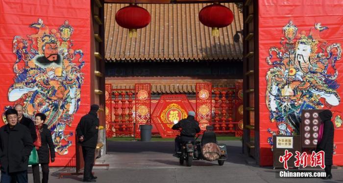 資料圖:農歷除夕當天,北京地壇公園入口被大幅門神和大紅燈籠等裝飾一新。中新社記者 侯宇 攝