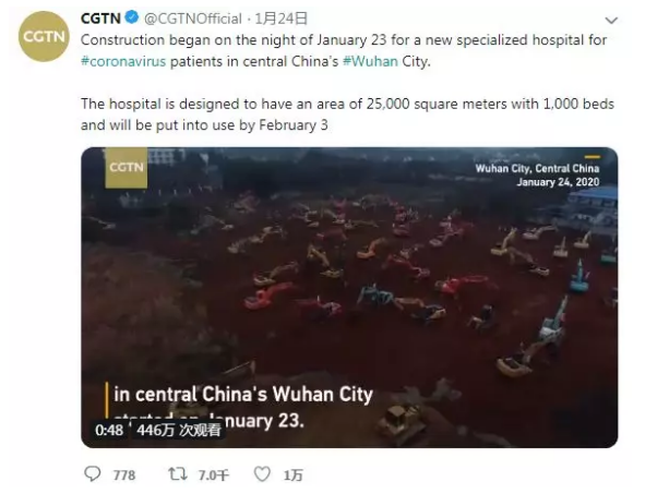 昨晚,CGTN在推特發布的一條關于武漢火神山醫院工地施工現場的視頻一舉沖上該平臺國際新聞首頁熱門,觀看量超446萬,超過153萬的全球網友參與互動。