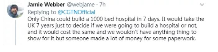 “只有中國才能在7天內修建一個容納1000張床位的醫院了!這在英國,花上7年的時間也就只夠決定到底能不能建造一個醫院.......”
