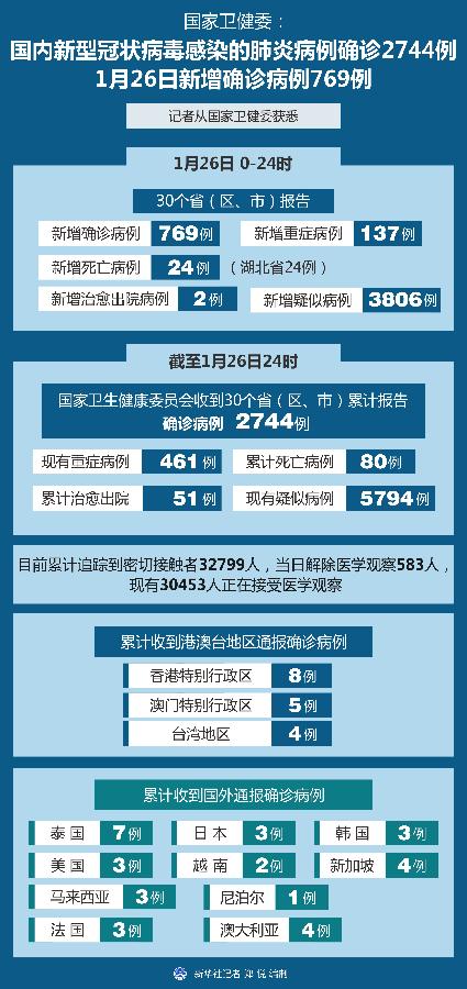 截至1月26日24時,國家衛(wèi)生健康委員會收到30個省(區(qū)、市)累計報告確診病例2744例,現有重癥病例461例,累計死亡病例80例,累計治愈出院51例。現有疑似病例5794例。
