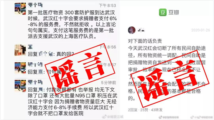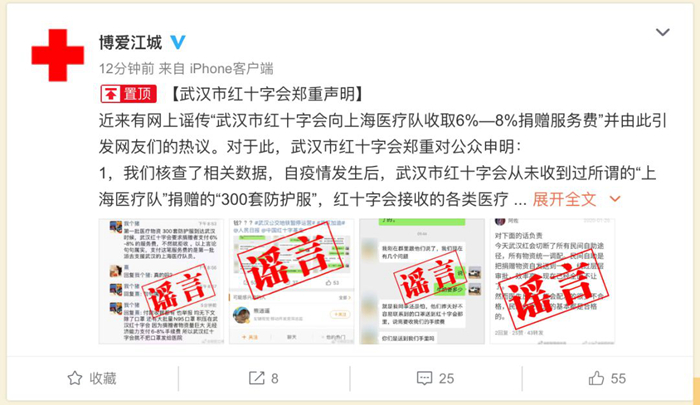 武漢市紅十字會呼吁廣大網(wǎng)友,不要讓謠言玷污了各界愛心企業(yè)和愛心人士的善意之舉,疫情面前,不信謠、不傳謠,眾志成城,共渡難關(guān)。