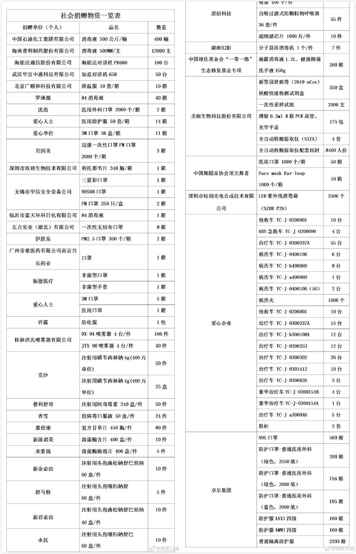 長安街知事(微信ID:Capitalnews)注意到,疫情發(fā)生以來,武漢紅十字會收到了大量社會捐贈款物,并分3期公布了相關(guān)清單。