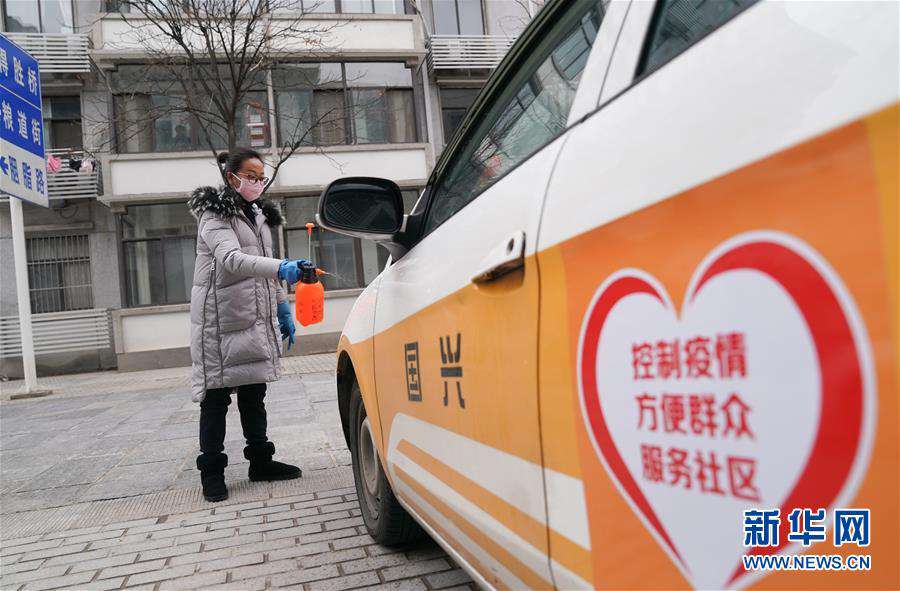 1月27日,武漢市武昌區糧道街曇華林社區干部在給配給社區使用的出租車消毒。新華社記者 程敏 攝