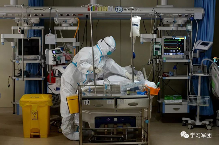 1月27日上午,海軍軍醫大學醫療隊醫護人員在漢口醫院重癥監護室對新型冠狀病毒感染的肺炎患者進行救治。醫護人員密切關注患者病情,根據變化調整輸液速度。解放軍報記者范顯海攝