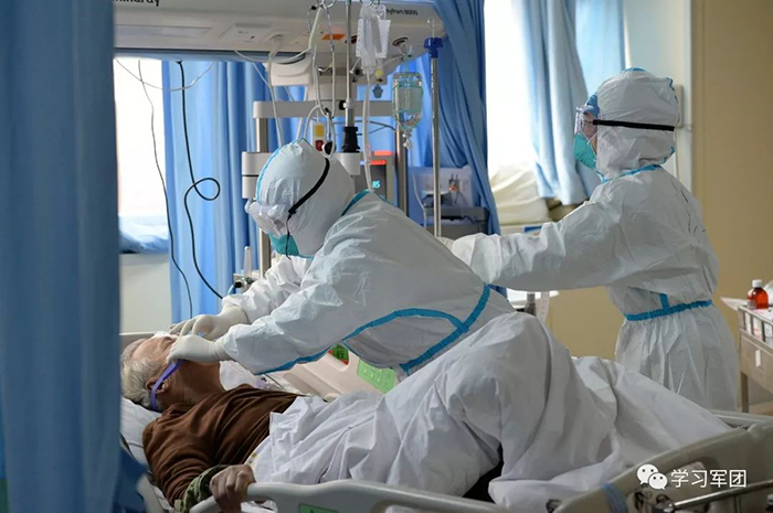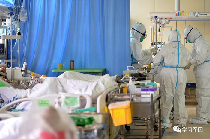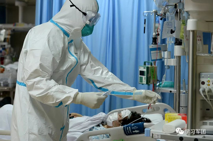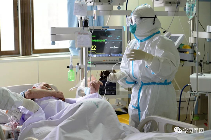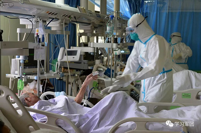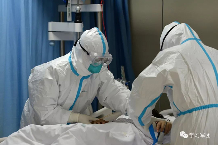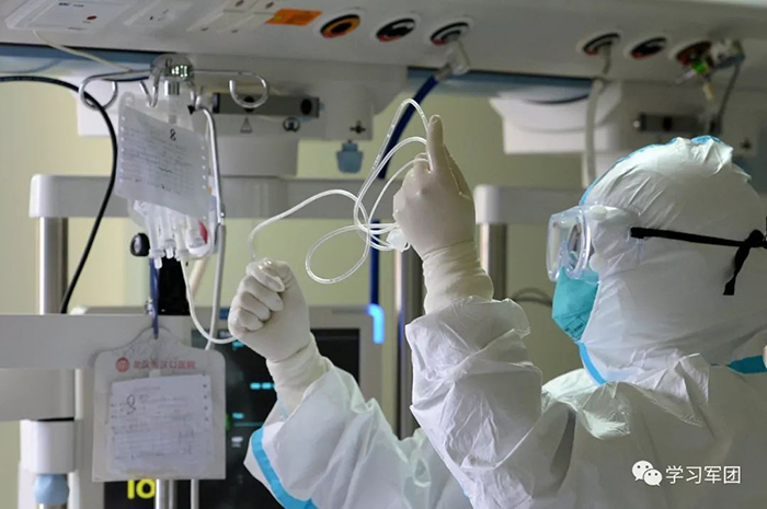 1月27日上午,海軍軍醫大學醫療隊醫護人員在漢口醫院重癥監護室對新型冠狀病毒感染的肺炎患者進行救治。醫護人員對患者進行輸液護理。解放軍報記者范顯海攝
