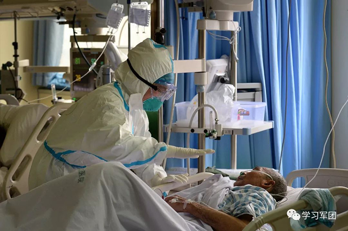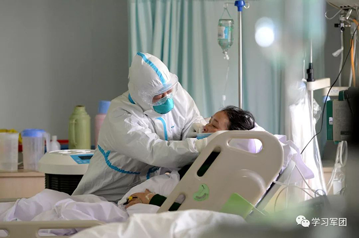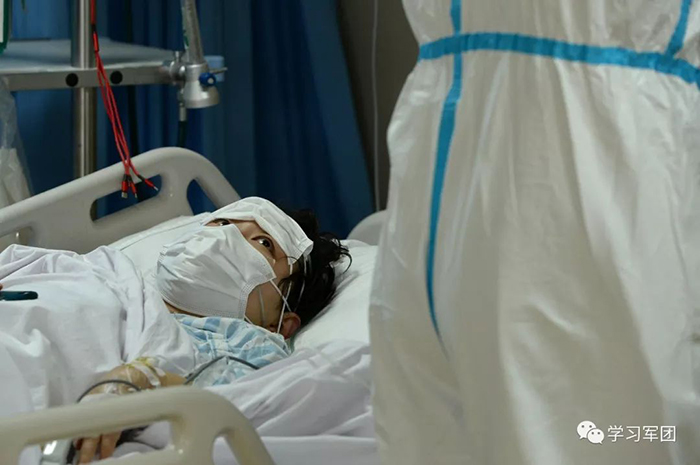 1月27日上午,海軍軍醫大學醫療隊醫護人員在漢口醫院重癥監護室對新型冠狀病毒感染的肺炎患者進行救治。醫護人員耐心安撫患者。解放軍報記者范顯海攝