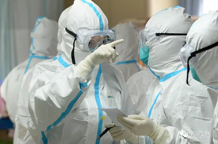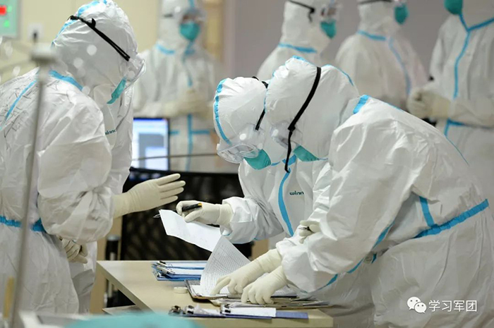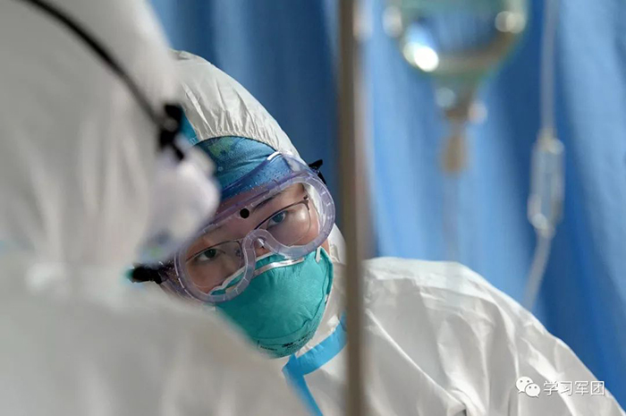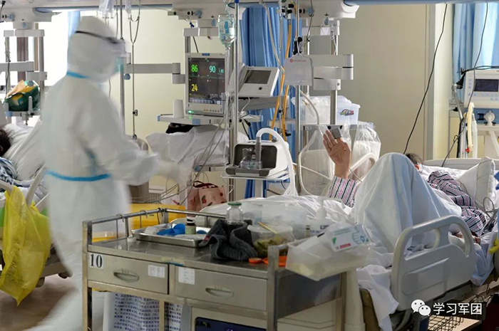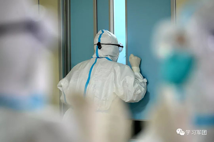 1月27日上午,海軍軍醫大學醫療隊醫護人員在漢口醫院重癥監護室對新型冠狀病毒感染的肺炎患者進行救治。醫護人員與監護室外人員隔門交流。解放軍報記者范顯海攝