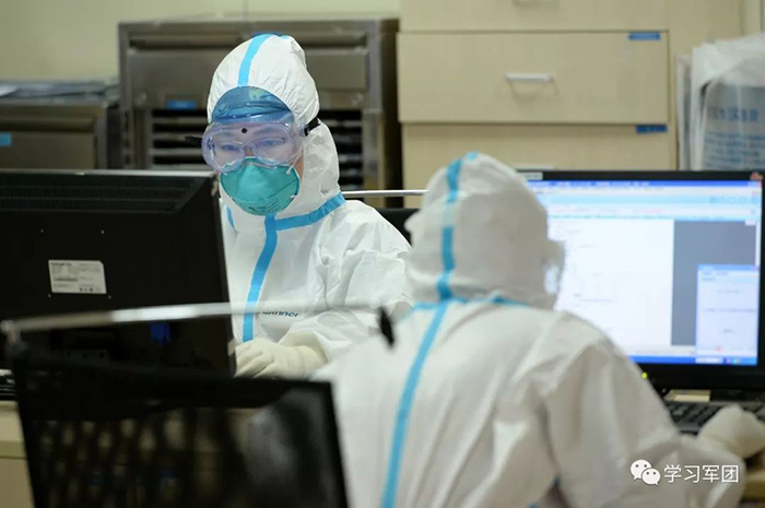 1月27日上午,海軍軍醫大學醫療隊醫護人員在漢口醫院重癥監護室對新型冠狀病毒感染的肺炎患者進行救治。醫護人員查看檢查結果,評估患者病情。解放軍報記者范顯海攝