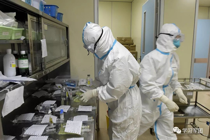 1月27日上午,海軍軍醫大學醫療隊醫護人員在漢口醫院重癥監護室對新型冠狀病毒感染的肺炎患者進行救治。醫護人員配備藥品。解放軍報記者范顯海攝