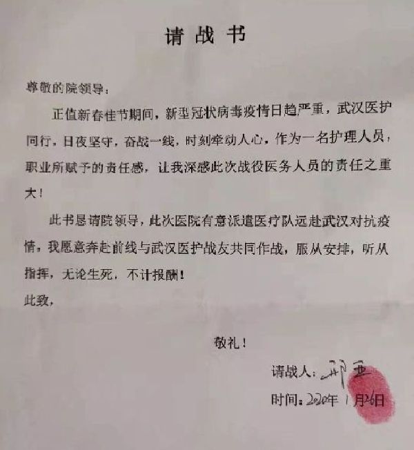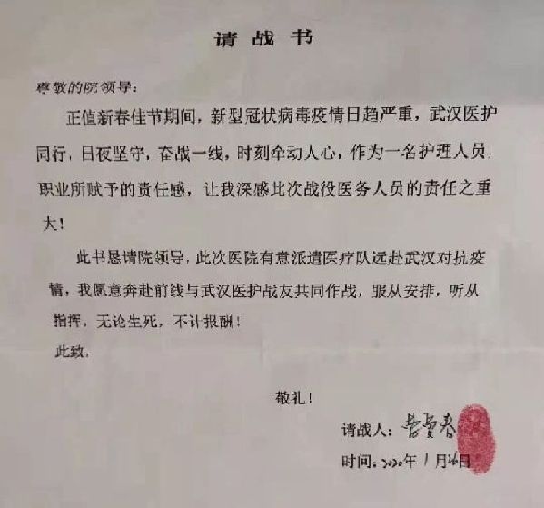 甘肅省定西市人民醫(yī)院新生兒科護(hù)士長曹愛春和護(hù)士邢亞半夜寫下請(qǐng)戰(zhàn)書,懇請(qǐng)?jiān)悍脚鷾?zhǔn)奔赴一線。落款時(shí),兩人寫了八個(gè)字:無論生死,不計(jì)報(bào)酬。(定西市人民醫(yī)院供圖)