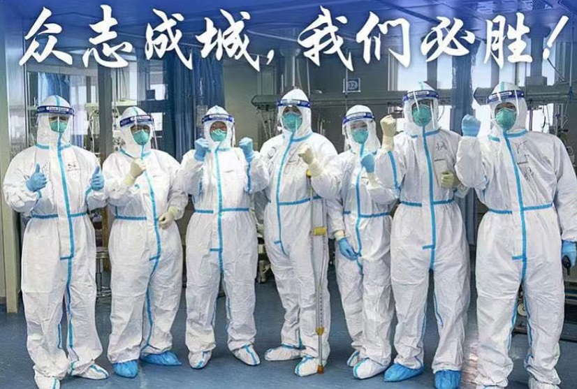 1月24日,武漢大學中南醫(yī)院重癥隔離病房內的醫(yī)護人員一起鼓勁加油。