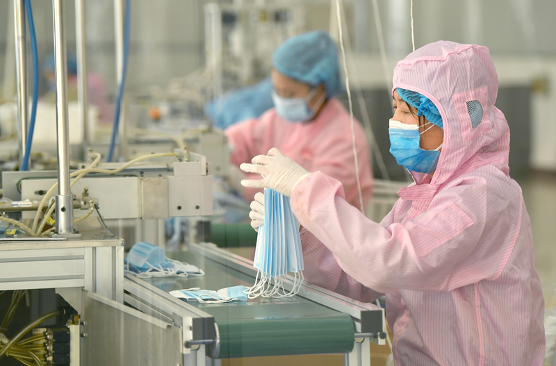 為助力抗擊新型冠狀病毒感染的肺炎疫情,陜西省西安市10家生產防護消毒用品的單位已緊急召回、招聘員工,滿負荷生產,以保障口罩、消毒液等防護消毒用品的穩定供給。圖為1月29日,西安市鄠邑區一公司員工在制作口罩。