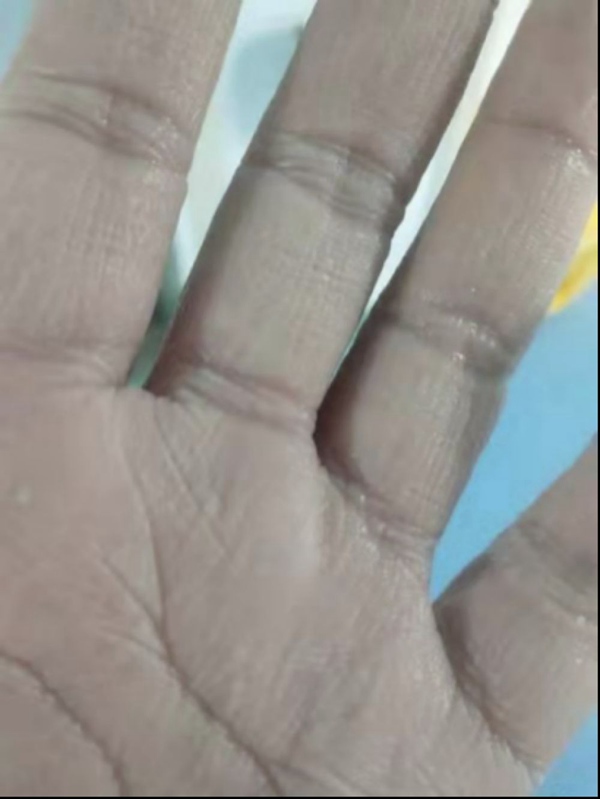 連續(xù)工作8小時(shí),中國(guó)科大附一院(安徽省立醫(yī)院)援鄂醫(yī)療隊(duì)隊(duì)員樊華手掌被汗水泡皺。