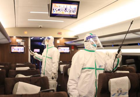 2月4日,中國鐵路北京局集團(tuán)有限公司對返回北京動車段的復(fù)興號進(jìn)行車內(nèi)消毒作業(yè)。張晴/攝