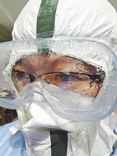 9日,國家緊急醫(yī)學(xué)救援隊(duì)(海南)隊(duì)員、海南醫(yī)學(xué)院第一附屬醫(yī)院醫(yī)生程少文承擔(dān)武漢國際會展中心方艙醫(yī)院的值班任務(wù),不到兩小時護(hù)目鏡上的霧氣就形成了大片積水。國家緊急醫(yī)學(xué)救援隊(duì)(海南)供圖
