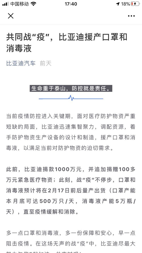 2月8日,“比亞迪汽車”微信號一篇《共同戰(zhàn)“疫”,比亞迪援產(chǎn)口罩和消毒液》引發(fā)網(wǎng)友關(guān)注,文章稱,比亞迪將在2月17日前后預(yù)計量產(chǎn)出貨口罩和消毒液(口罩產(chǎn)能本月底可達(dá)500萬只/天,消毒液產(chǎn)能5萬瓶/天),直至疫情緩解和消除。