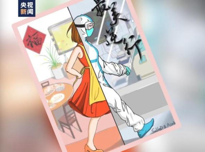 設(shè)計師董思喬的母親,是北京大學(xué)人民醫(yī)院的一名醫(yī)務(wù)工作者。在董思喬七歲那年,正逢非典暴發(fā),她的母親堅守崗位留在醫(yī)院救治患者。十七年后,新冠肺炎來襲,她看到很多醫(yī)務(wù)工作者也像當(dāng)年她的母親一樣在最危險的地方戰(zhàn)斗,義無反顧,馳援武漢。于是,她拿出畫筆畫出她心中醫(yī)務(wù)工作者們最美的樣子:“身后,是飄香的飯菜,是溫馨的家;面前,是防疫一線,是需要救治的患者。逆行者們,愿你們平安歸來。”