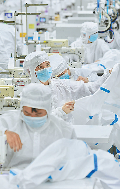 2月4日,福建晉江市一間無菌實驗室,工人正在加緊生產防護服,為防疫一線提供物資保障。新華社記者 姜克紅攝