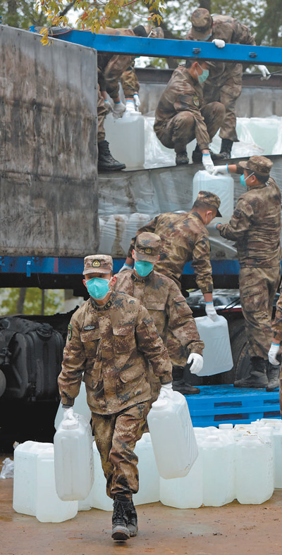 2月10日,河北邯鄲市一家愛心組織為火神山醫院捐贈的百噸醫用消毒原液運抵武漢并予交接,圖為醫療隊隊員在快速搬運醫療物資。范顯海攝(新華社發)