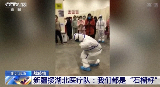 拍攝這段視頻的地方,是武漢市東西湖方艙醫院。跟著扭的、圍觀的,都是住院的“新冠肺炎”患者。領舞的人,是從新疆遠道而來的護士。動作優美,節奏鏗鏘。