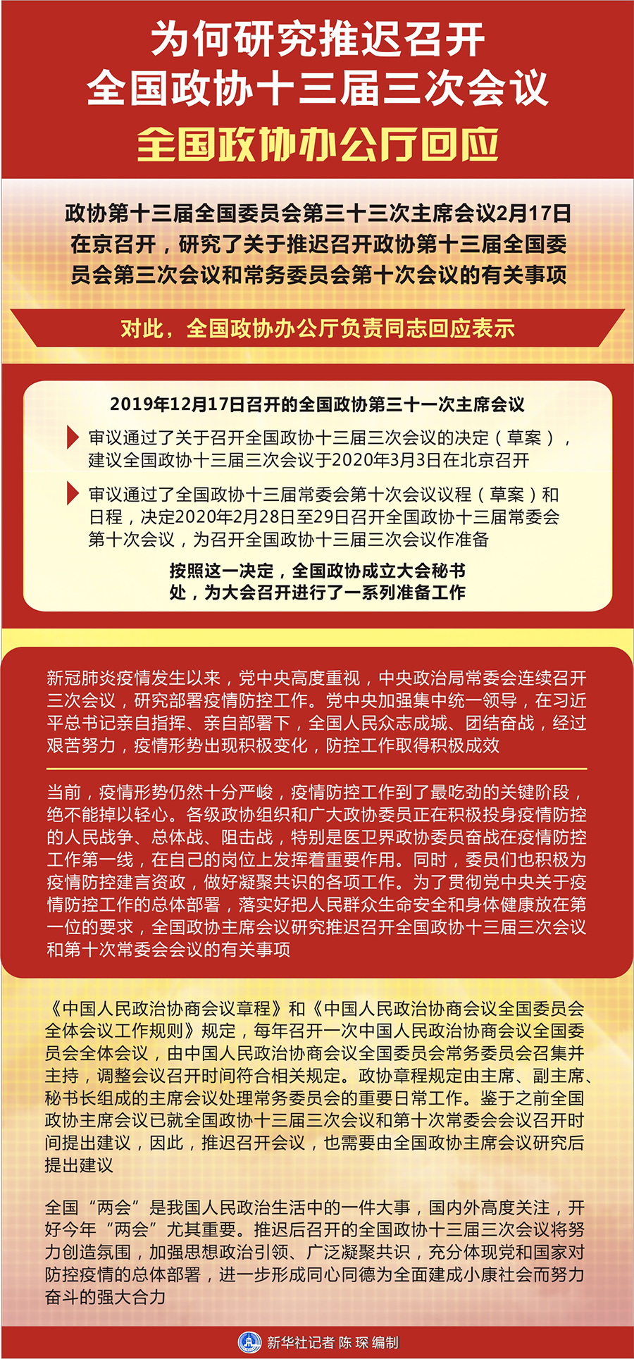 新華社北京2月17日電 政協(xié)第十三屆全國委員會(huì)第三十三次主席會(huì)議17日在京召開,研究了關(guān)于推遲召開政協(xié)第十三屆全國委員會(huì)第三次會(huì)議和常務(wù)委員會(huì)第十次會(huì)議的有關(guān)事項(xiàng)。對(duì)此,全國政協(xié)辦公廳負(fù)責(zé)同志回應(yīng)表示,2019年12月17日召開的全國政協(xié)第三十一次主席會(huì)議,審議通過了關(guān)于召開全國政協(xié)十三屆三次會(huì)議的決定(草案),建議全國政協(xié)十三屆三次會(huì)議于2020年3月3日在北京召開;審議通過了全國政協(xié)十三屆常委會(huì)第十次會(huì)議議程(草案)和日程,決定2020年2月28日至29日召開全國政協(xié)十三屆常委會(huì)第十次會(huì)議,為召開全國政協(xié)十三屆三次會(huì)議作準(zhǔn)備。按照這一決定,全國政協(xié)成立大會(huì)秘書處,為大會(huì)召開進(jìn)行了一系列準(zhǔn)備工作。