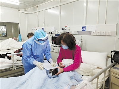 按照“紅區(qū)”病房的要求,非醫(yī)務(wù)人員不得進(jìn)入,黃舒和隊(duì)友需身兼數(shù)職,除了做日常治療和護(hù)理外,她還要負(fù)責(zé)打掃衛(wèi)生、病區(qū)消毒、照顧患者飲食起居等工作。“紅區(qū)”老年病人占據(jù)大比例,由于病人病情較重,黃舒和戰(zhàn)友需要幫他們喂飯喂水、接大小便、洗漱洗手等,工作量和辛苦程度可想而知。