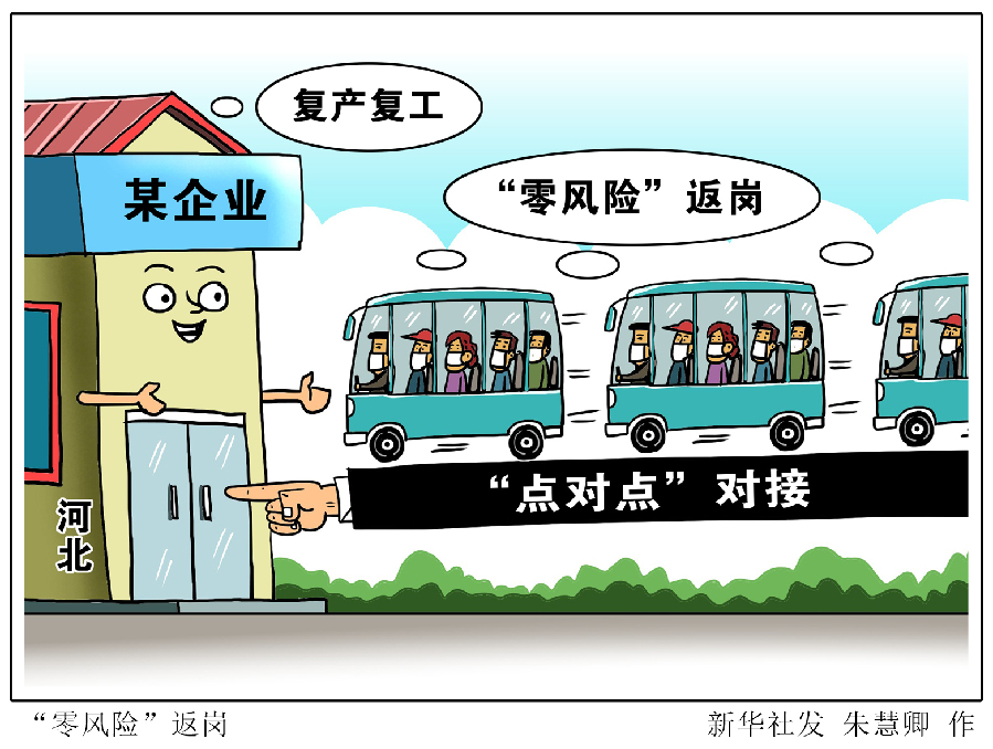 漫畫(huà):“零風(fēng)險(xiǎn)”返崗 為確保務(wù)工人員“零風(fēng)險(xiǎn)”輸出和輸入,河北各地前移疫情防控三道防線,按照“全流程控管、全方位服務(wù)、全天候監(jiān)測(cè)”的要求,精準(zhǔn)定向?yàn)槠髽I(yè)輸送務(wù)工人員,滿(mǎn)足企業(yè)復(fù)工復(fù)產(chǎn)和農(nóng)民外出務(wù)工增收的雙重需求。 新華社發(fā) 朱慧卿 作